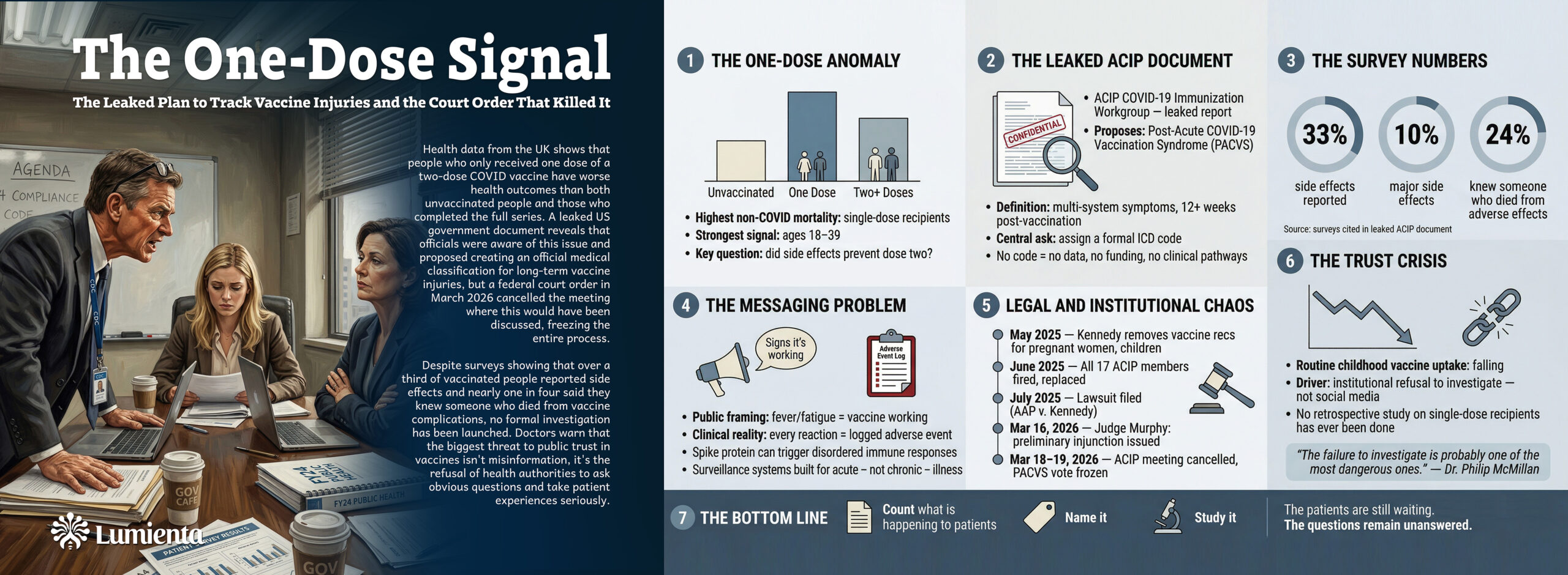 Why this is important: A leaked federal advisory document proposed recognizing chronic post-vaccination injuries with a formal diagnostic code. Before the committee could act, a court injunction halted the meeting. Meanwhile, UK mortality data reveals a troubling pattern among single-dose recipients that remains uninvestigated, deepening public distrust in vaccine safety oversight.