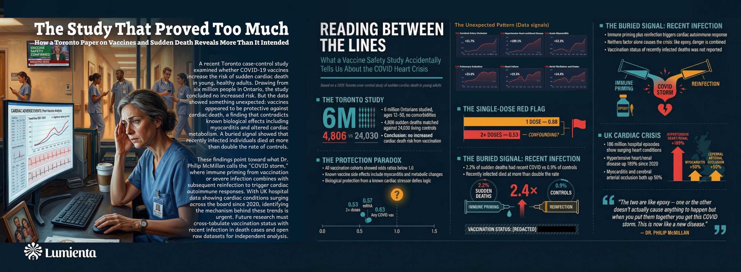 Why this is important: A Toronto case-control study concluded COVID vaccines do not increase sudden cardiac death risk, yet its own odds ratios suggested implausible cardiac protection. Combined with rising cardiovascular disease trends and higher sudden death rates among the recently infected, the findings point to unmeasured interactions between vaccination, infection, and heart damage.
